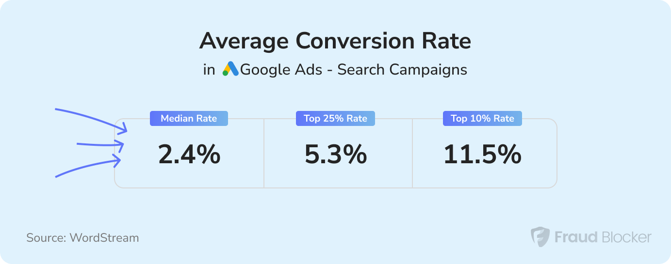 The average conversion rate for Google Ads across all industries is between 1% and 5%. A quarter of all businesses have a conversion rate of 1% or less, with most hovering at about 2.35%. The top 25% performers see about 5.3% conversion rates. (WordStream)