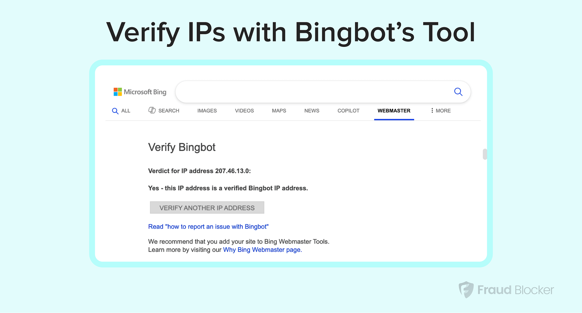We already covered how you can use the Bingbot verification tool to rapidly verify the IP address of a crawler visiting your website. If any of these steps fail, it is not guaranteed to be legitimate Bingbot and can be treated as suspicious.