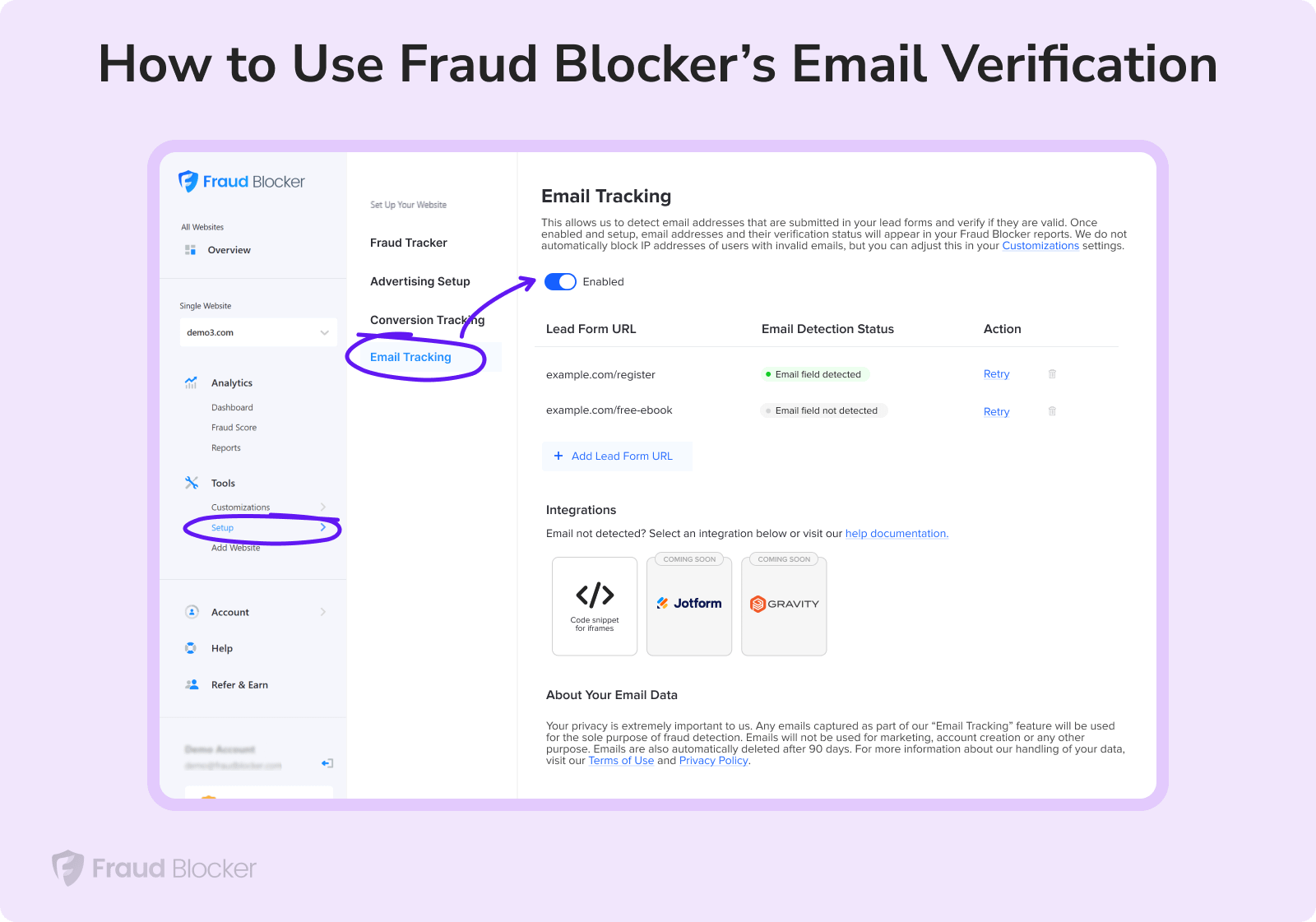 Setting up email verification in Fraud Blocker will take just a few minutes. If you’re already using the Fraud Tracker script for click fraud protection, you won’t need to install anything new as the same script now powers email verification automatically.