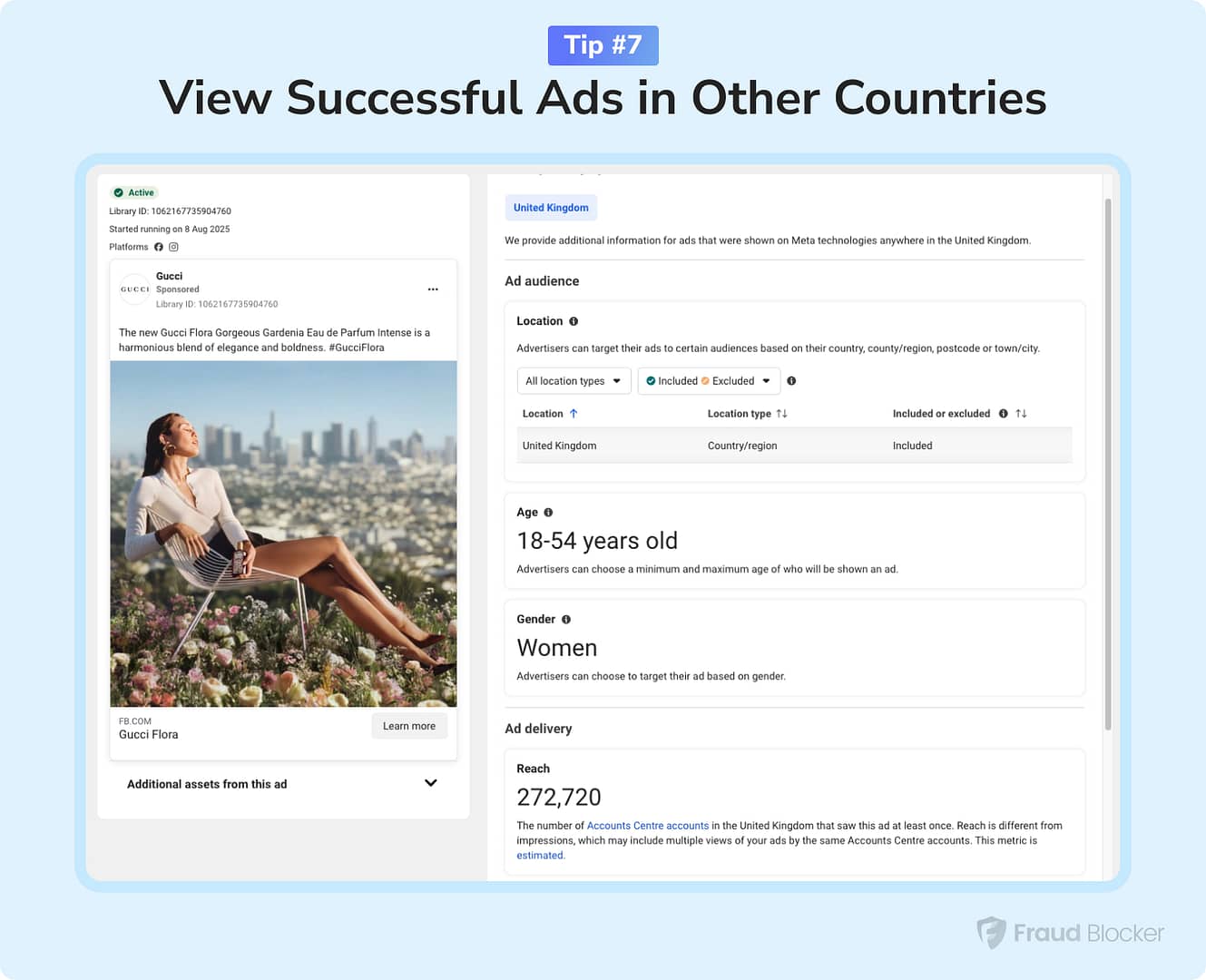 Ads that crush in one market may not have been tested in another. Or, they may contain fresh angles that won’t give your audience ad fatigue. Search by location in the Ads Library to see what’s working internationally. You might find creative angles, offers, or hooks that feel completely fresh to your audience.
