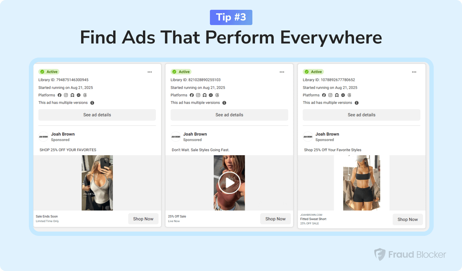 Look for ads running on several platforms. This often signals that the creative is performing well across different user behaviors and formats. Brands may use this approach to keep messaging consistent, reach different audience segments without building separate campaigns, or test whether a single creative concept can work across platforms before scaling.