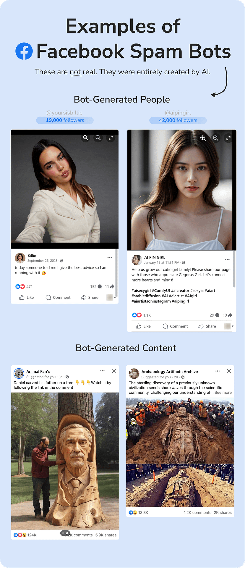 Today’s bots are powered by AI, making them extremely life-like and difficult to detect. They can mimic real user interactions, which can mislead audiences and undermine the authenticity Facebook claims to uphold.