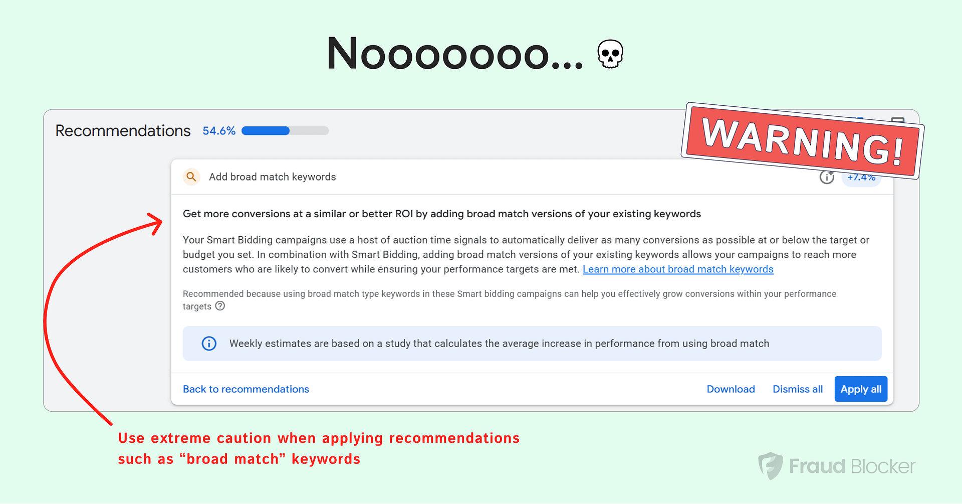 Our take: there is no definitive strategy for which recommendations to enable, so you may have to experiment with them. But keep in mind that 1) many of these are turned on by default, and 2) keeping them on doesn’t always equal better performing ads.