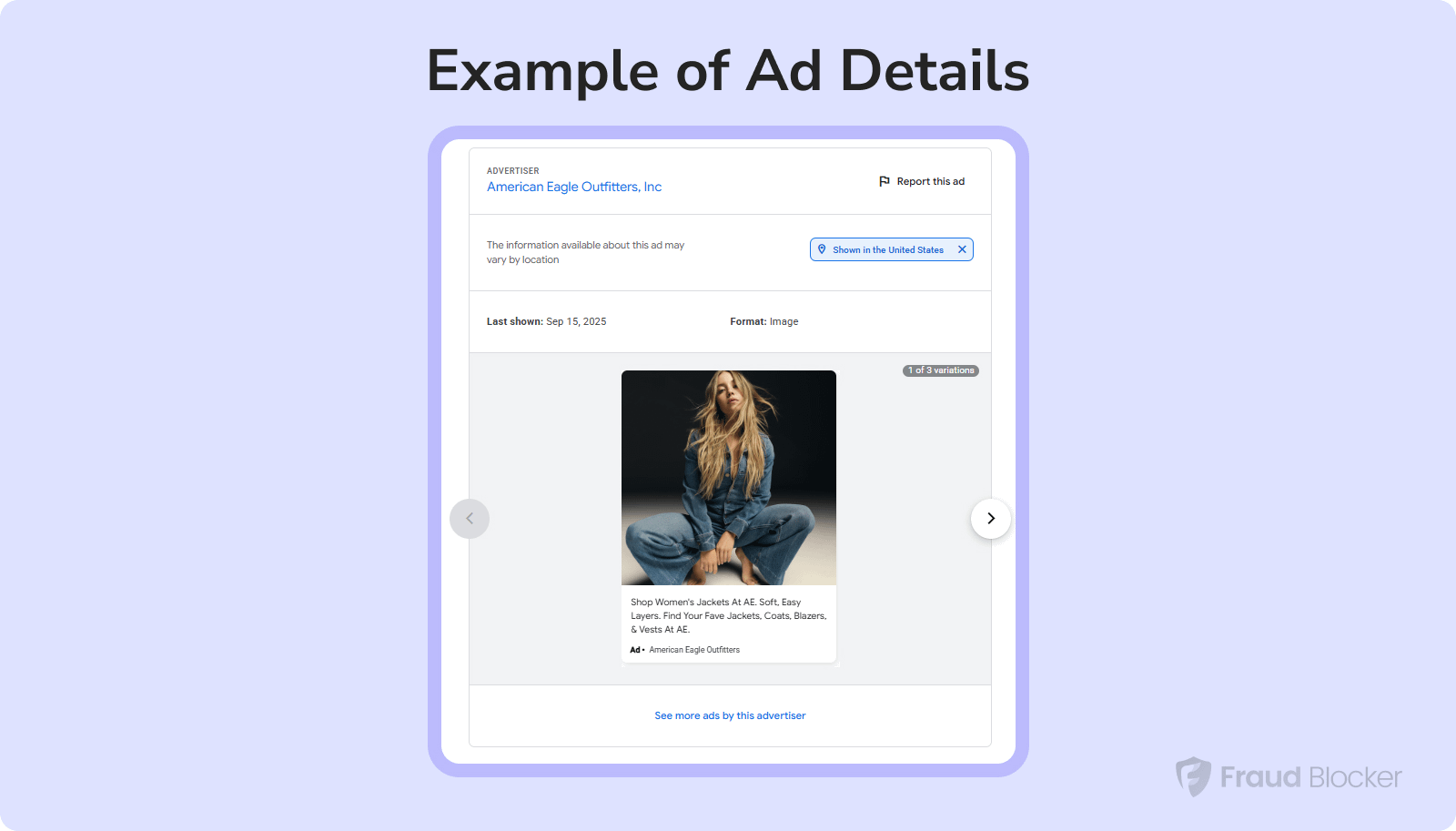 - Advertiser details: Who’s running the ad, including their verified name and country the ad is shown.