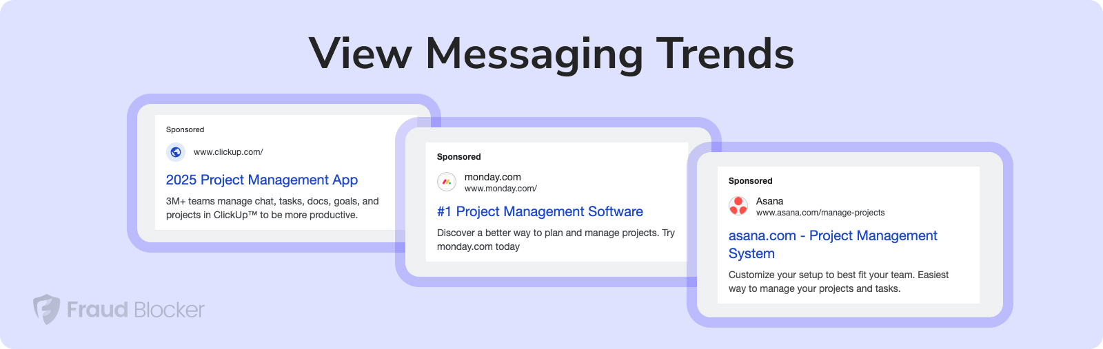Build a list of the top players in your category: direct competitors, emerging brands, and even adjacent industries, and then analyze their ads side by side. Below are example ads for project management software: