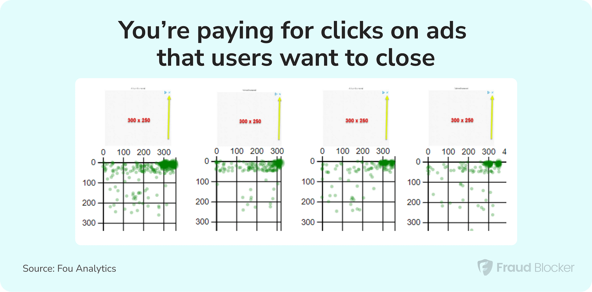 Google Ads also charges you if your intent is to close the ad by pressing the “X” in the upper right corner, as shown in an excellent heat map from Dr Augustine Fou: