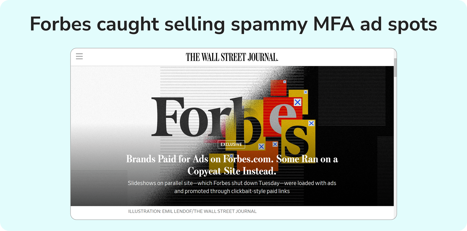 The WSJ revealed in March 2024, that Forbes had knowingly sold ads under a subdomain, www3.forbes.com, that contained spammy Made-for-advertising web pages (“MFA.”) MFA sites are largely designed to generate clicks from users with an extremely high volume of ads on the page and placements of ads over critical navigation links. This ad inventory was sold as normal www.forbes.com without any disclosures from the publisher.
