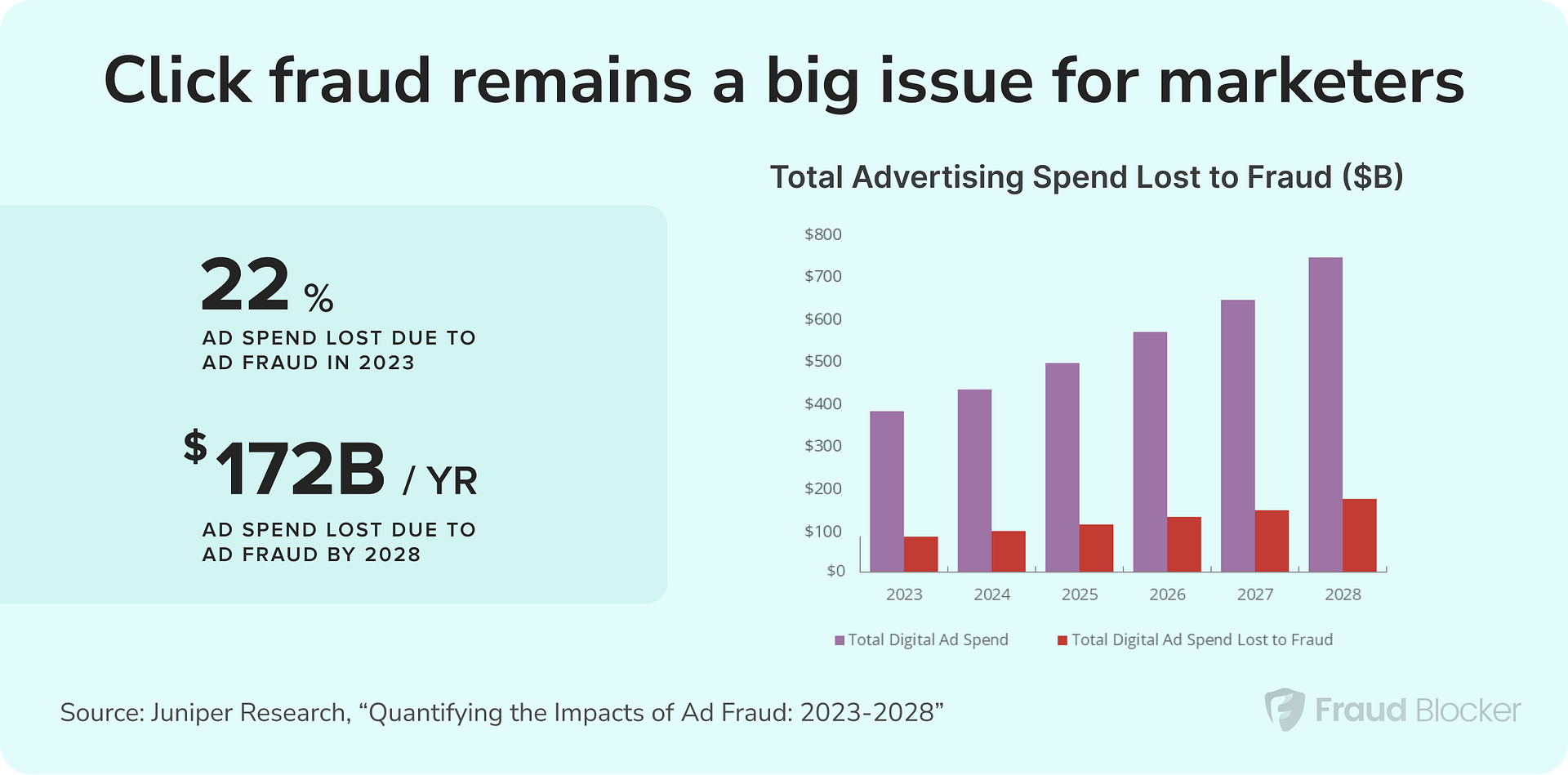 Based on an in-depth study conducted by Juniper Research, 22% of all ad spend is lost due to fraud. This totals $84 billion in wasted ad spend in 2023.