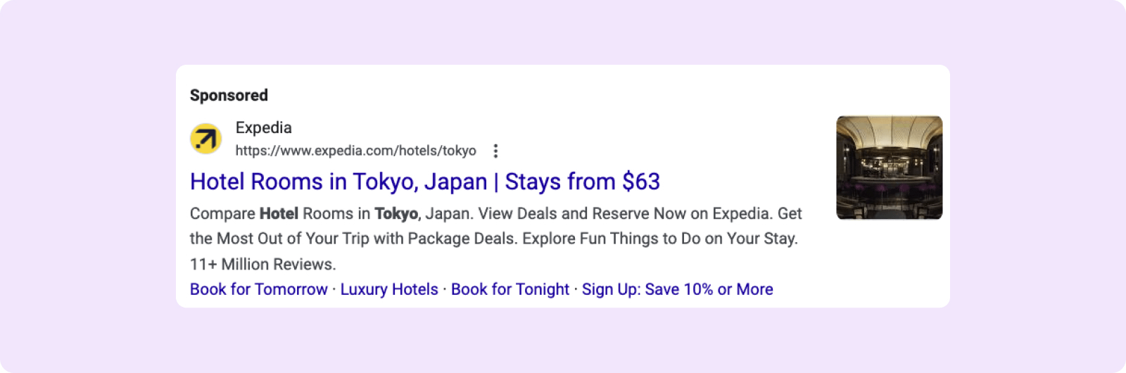 This Expedia ad speaks directly to the needs of travelers looking for hotel rooms in Tokyo: