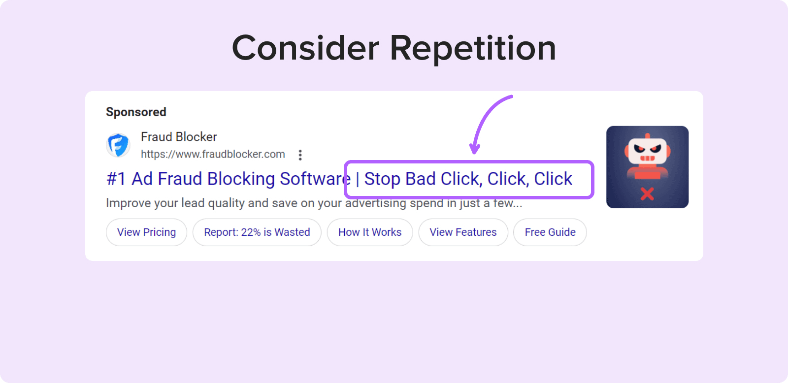For example: repetition can be powerful when used smartly (and sparingly). Reinforce key points by repeating important words or phrases throughout your ad copy.