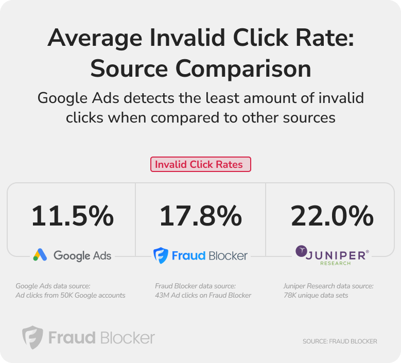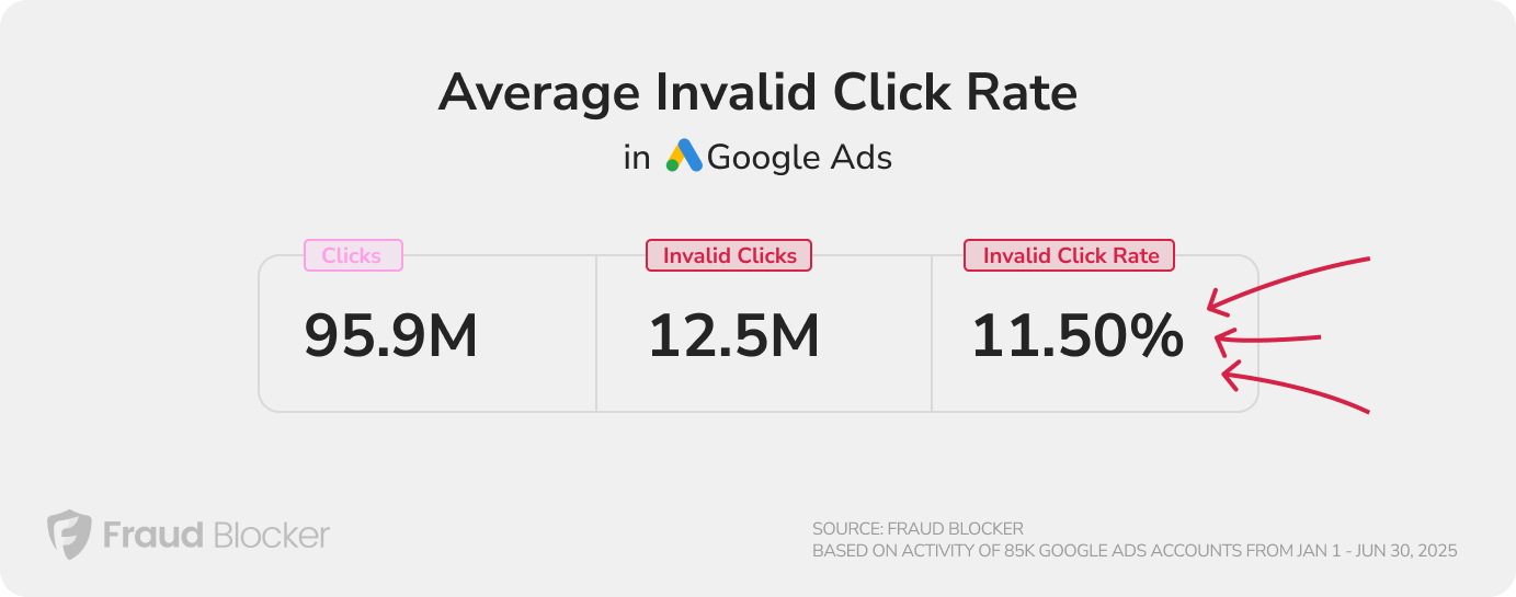 The average invalid click rate for Google Ads is 11.5%. This is an average across all industries and campaign types.