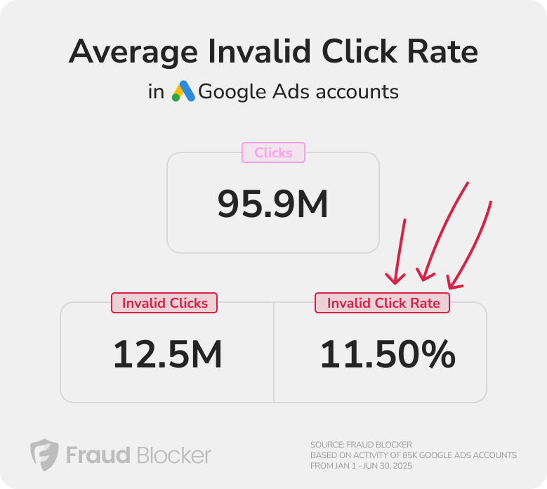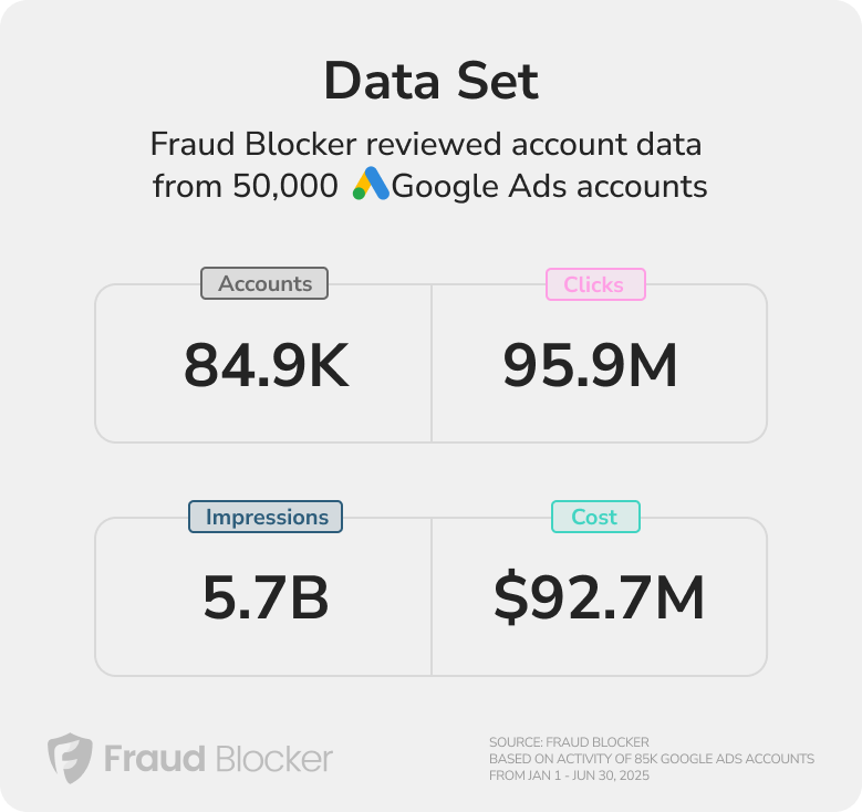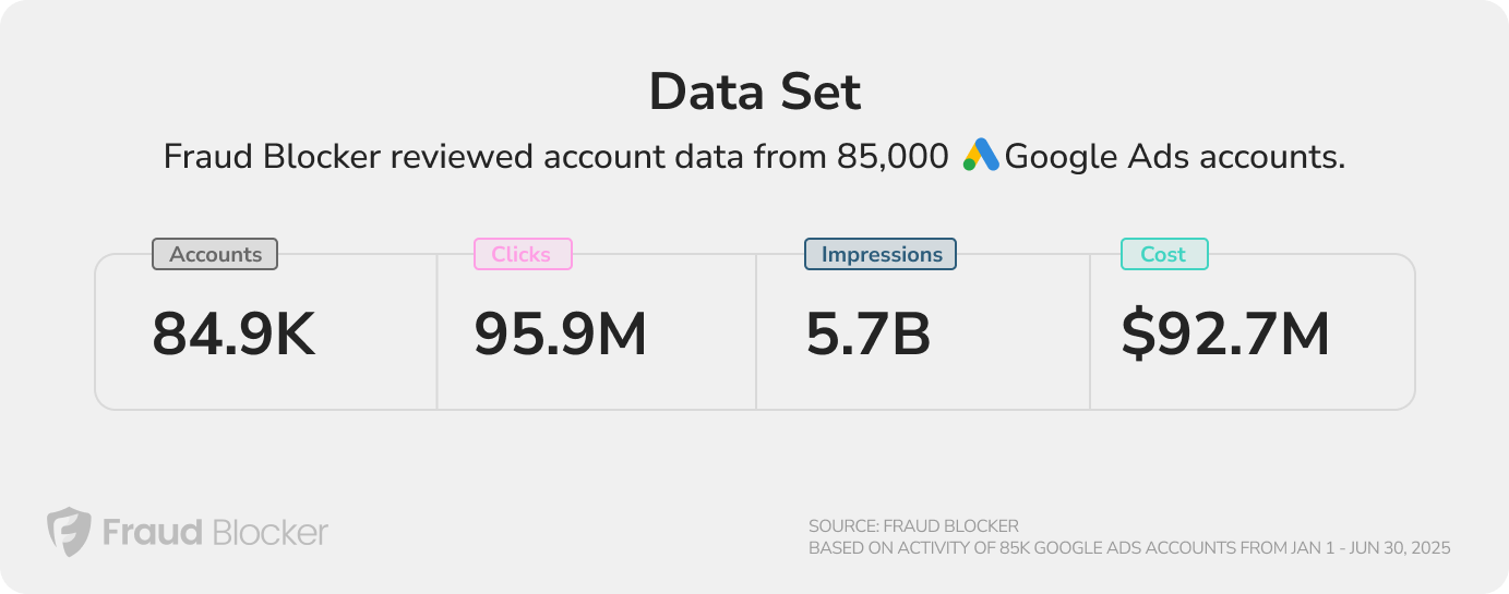 The data provided in this article is based on an analysis of 96 million ad clicks across 85,000 accounts and 24,582 active campaigns on Google Ads over a 6 month period, ending June 30, 2025. The data is provided from a section of Fraud Blocker’s data, based on their clients’ connections to the Fraud Blocker platform. All data in this report is anonymous.