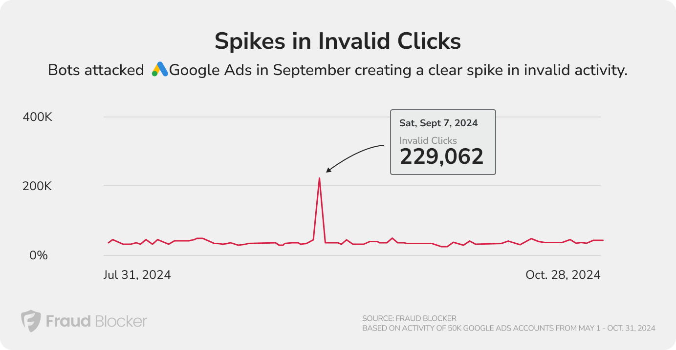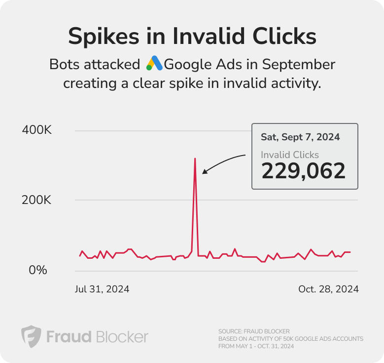 On some days there are spikes in invalid traffic. For example, on September 7, 2024, Google Ads had 40% of all clicks on Google determined to be invalid (229,000 invalid clicks). This is likely an attack on Google ad traffic that day by sophisticated bots. Google ultimately refunded customers.