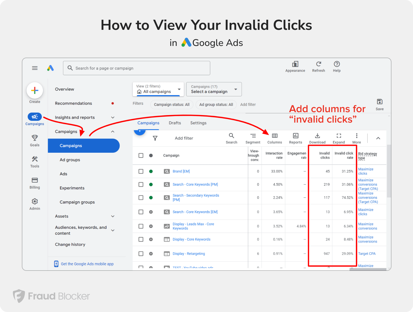 - Add “Invalid Clicks” and “Invalid Click Rate“, along with any other relevant data points.