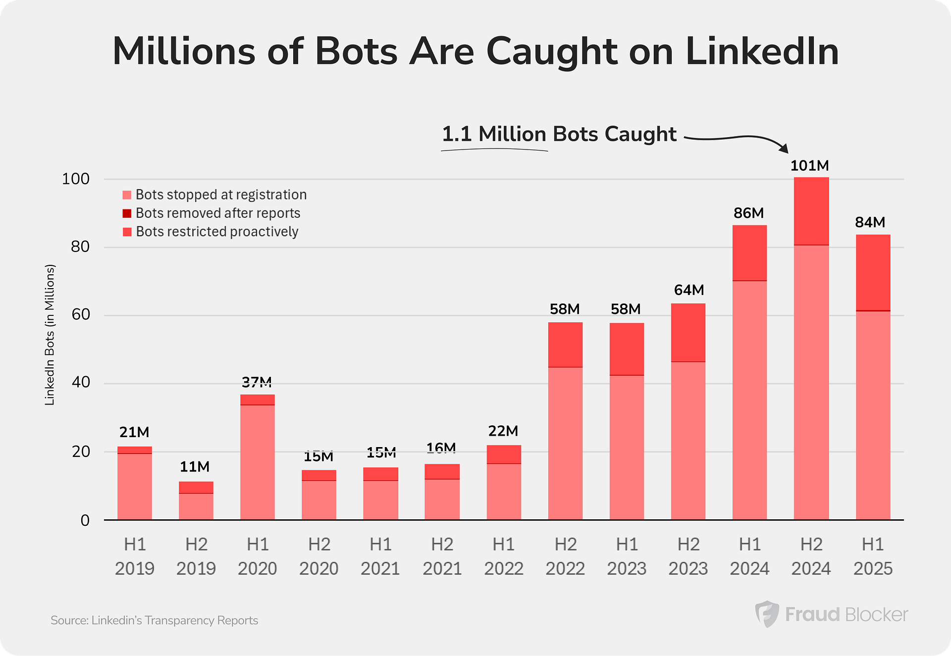 LinkedIn removed 200 million bot accounts in 2024, according to its transparency reports. That represents 16.7% of the platform’s 1.2 billion stated user base. In H1 2025, the removal rate was 83.7 million accounts in just six months, and LinkedIn’s automated defenses caught 97% of them before any user reported them.