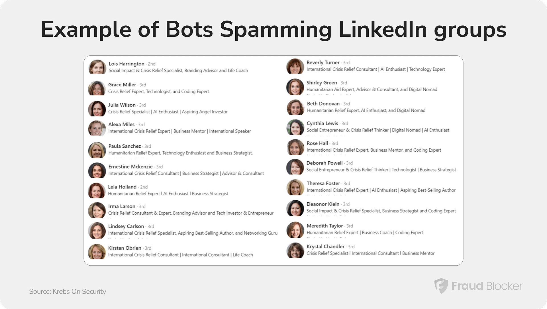Bot accounts flood invite-only LinkedIn groups with hundreds of fake profile requests, trying to join closed communities where professionals share sensitive industry information. According to a report on Krebs on Security, some groups, like Sustainability Professionals (300,000+ members) receive dozens of fake requests weekly.
