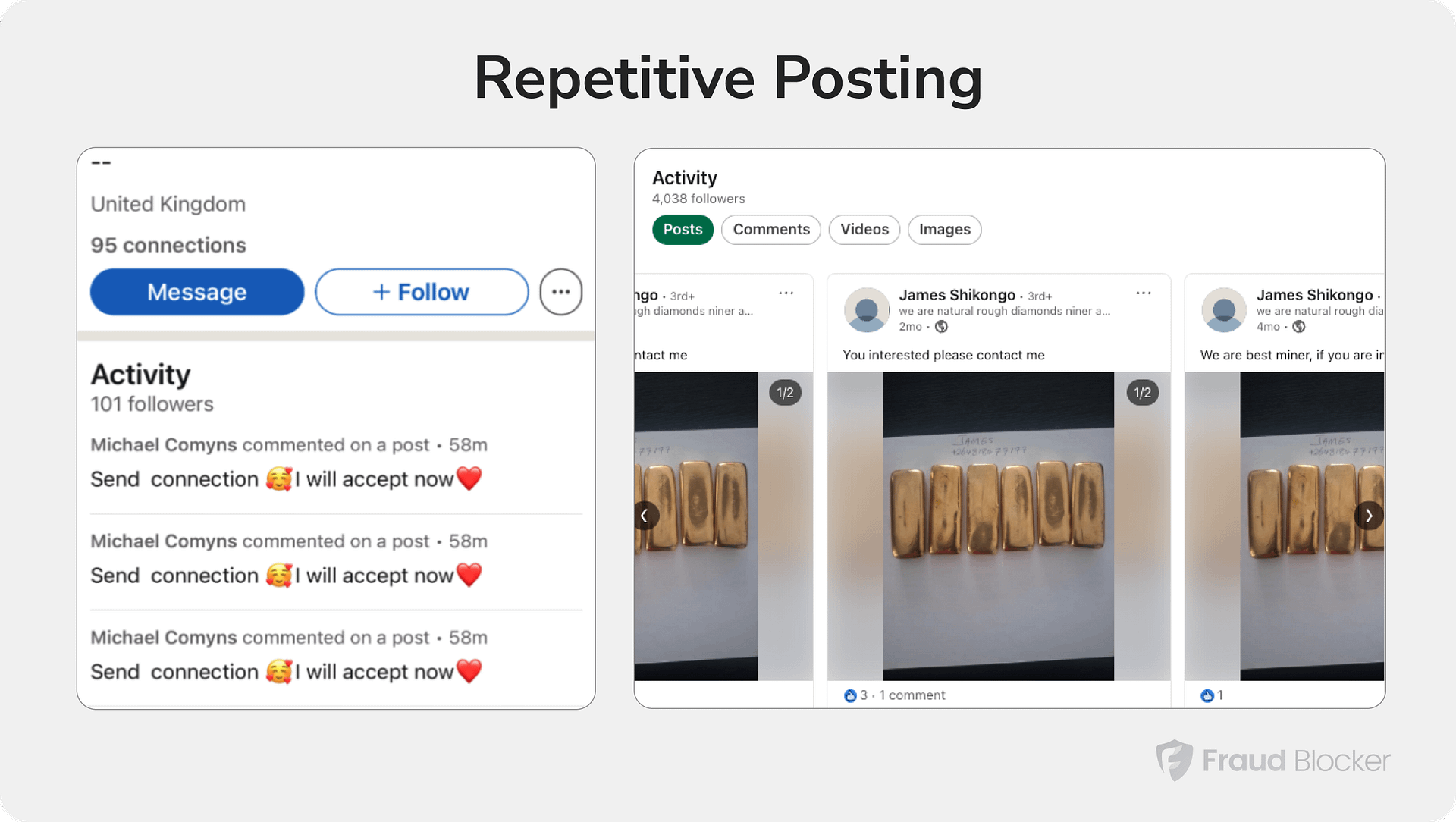 Bot-generated posts and comments are repetitive, add little value, and don’t reflect real human communication. Many are also designed to rapidly increase connections and build false trust signals.