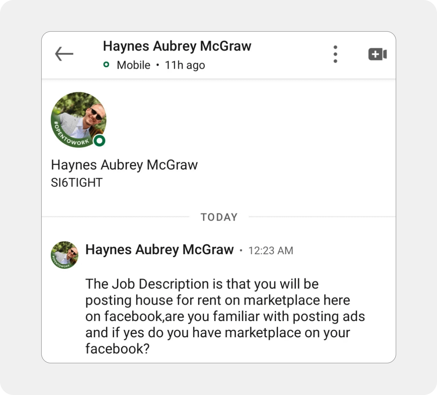 Some scams even recruit accomplices by asking “new hires” to use their real accounts to create fake marketplace listings or process fraudulent transactions.