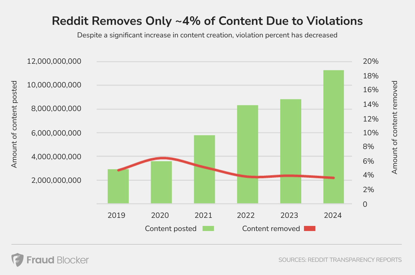 According to Reddit’s Transparency Report, 410 million pieces of content were removed from the platform in 2024, representing 3.6% of total content.