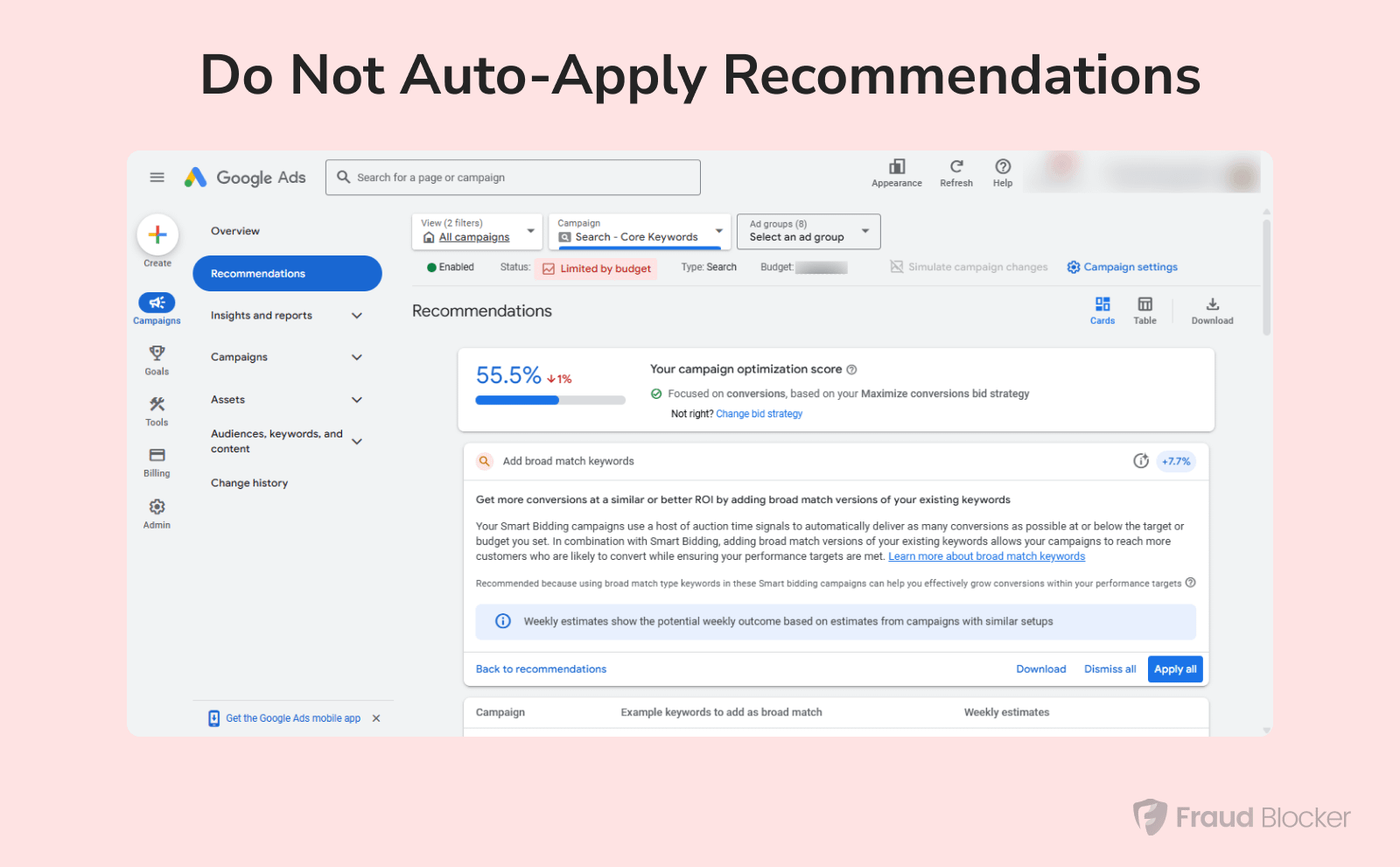 Be especially careful with recommendations that adjust your target CPA or ROAS, or automatically switch your campaigns to Smart bidding strategies, as these can lead to unexpected budget increases.