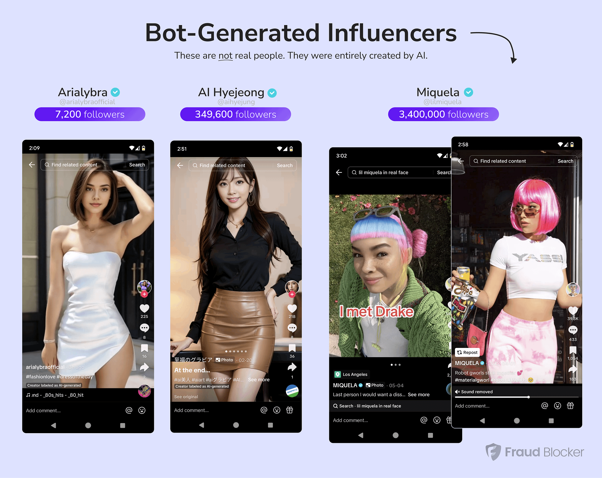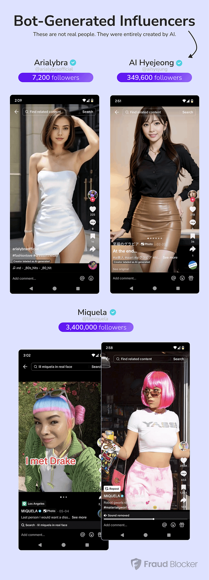 Take, for instance, the popular account of “Miquela.” She is entirely AI-generated, yet she’s now one of Time’s “25 Most influential people on the internet”, has officially signed with the talent agency CAA, has appeared with real-life celebrities such as Bella Hadid and earns over $10,000 per social media post.
