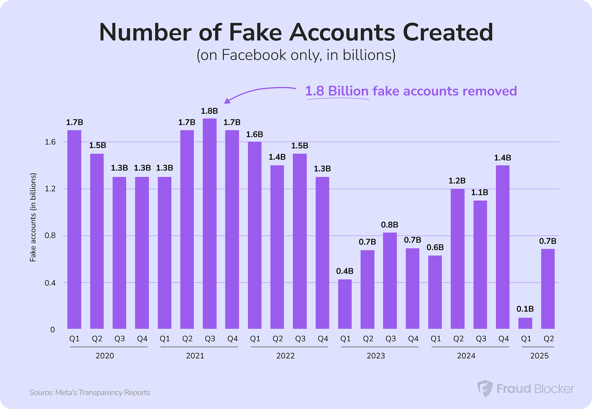 As of late 2023, Facebook reported 827 million accounts were fake (created by bots). They then removed these accounts as shown in the chart below.