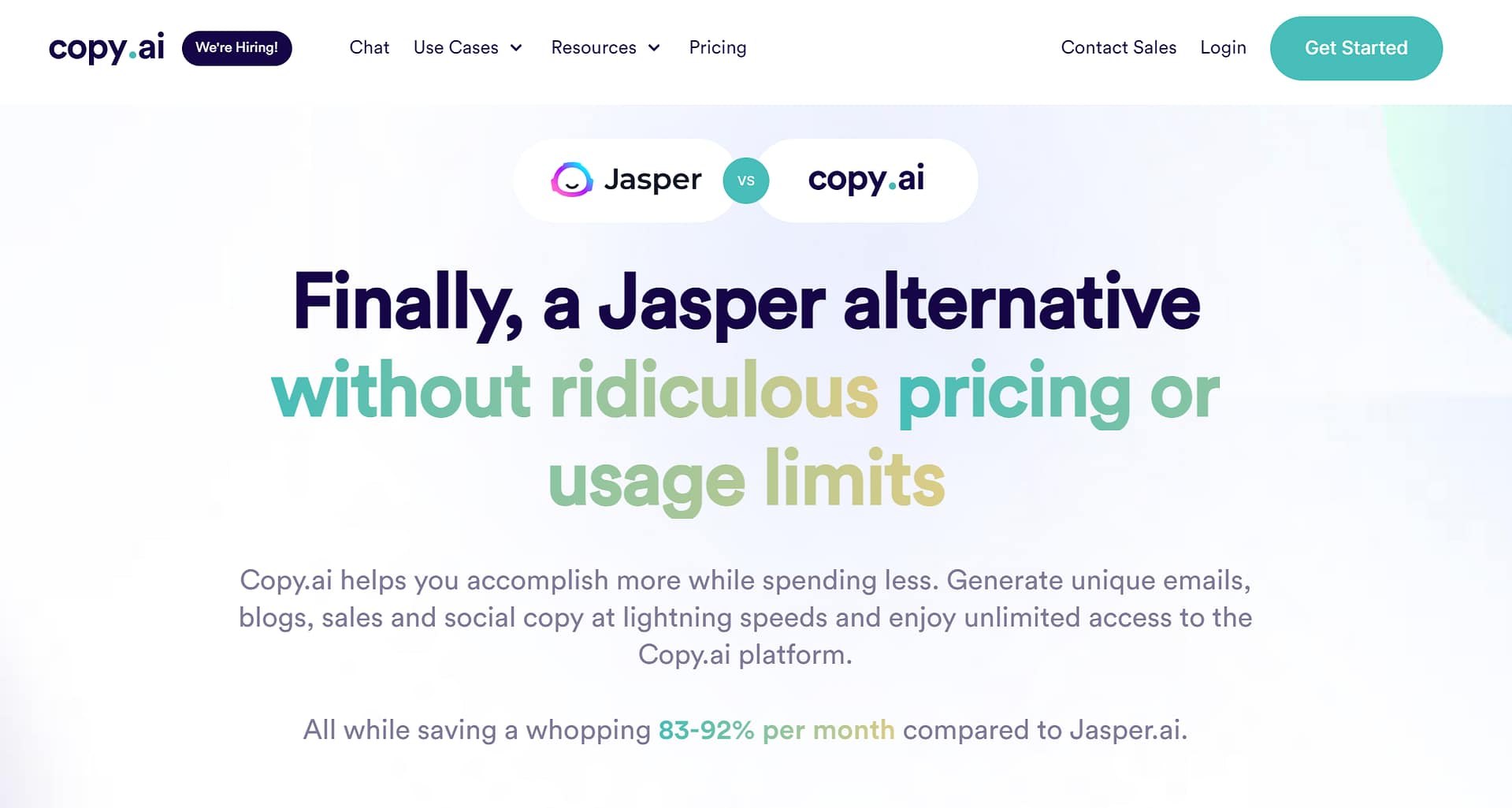Copy.ai is a great alternative to Jasper.ai with similar features, but far cheaper.