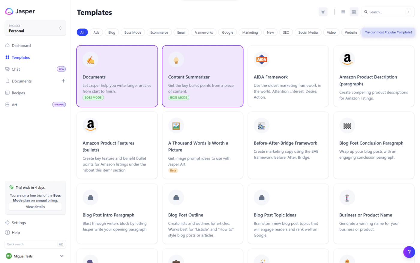 A common complaint among Jasper.ai users is that the base plans have strict word limits with a limited set of features that you will need to upgrade to use the tool effectively. Copy.ai offers nearly identical user-experience and features but without this added friction (note: both base plans start at $49 /mo, excluding the free trials).