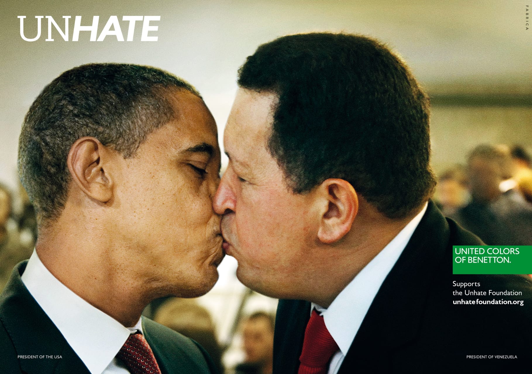Benetton’s “Unhate” campaign featured digitally manipulated images of world leaders kissing each other, including Barack Obama, Hu Jintao, Pope Benedict XVI, Angela Merkel, and many others. Imagine seeing this image 50 feet high on a billboard: