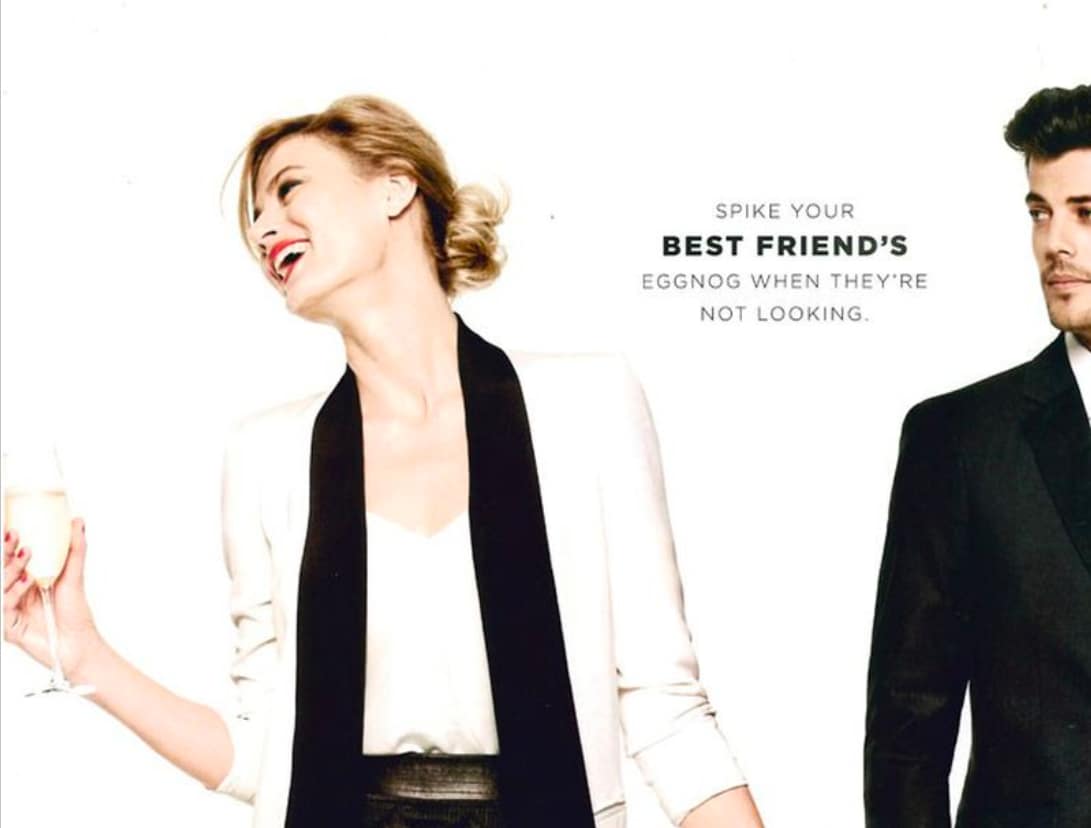 Bloomingdale’s holiday catalog featured an ad with the text, “Spike Your Best Friend’s Eggnog When They’re Not Looking”. It is difficult to understand what led to this campaign and messaging. The ad likely aimed to be playful and humorous, aligning with festive cheer and holiday mischievousness, but this ad was heavily criticized for seemingly promoting date rape culture, leading to widespread and harsh backlash.