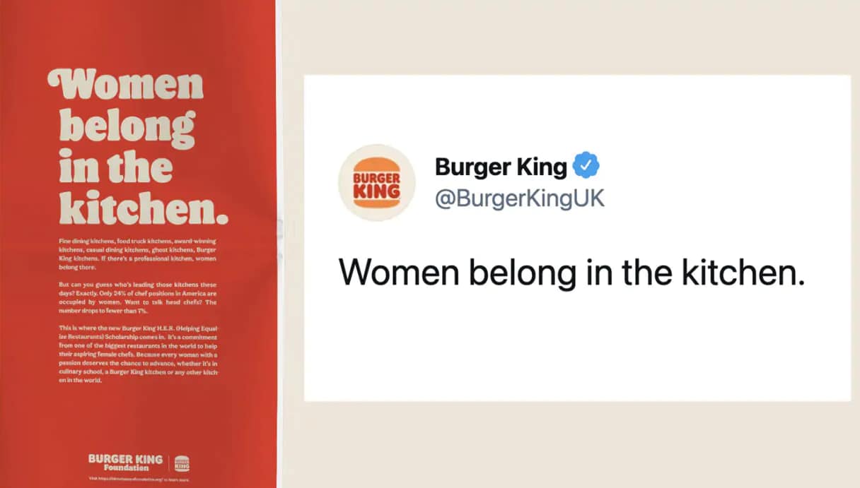 On International Women’s Day 2021, Burger King UK tweeted “Women belong in the kitchen” to promote a culinary scholarship for female chefs.