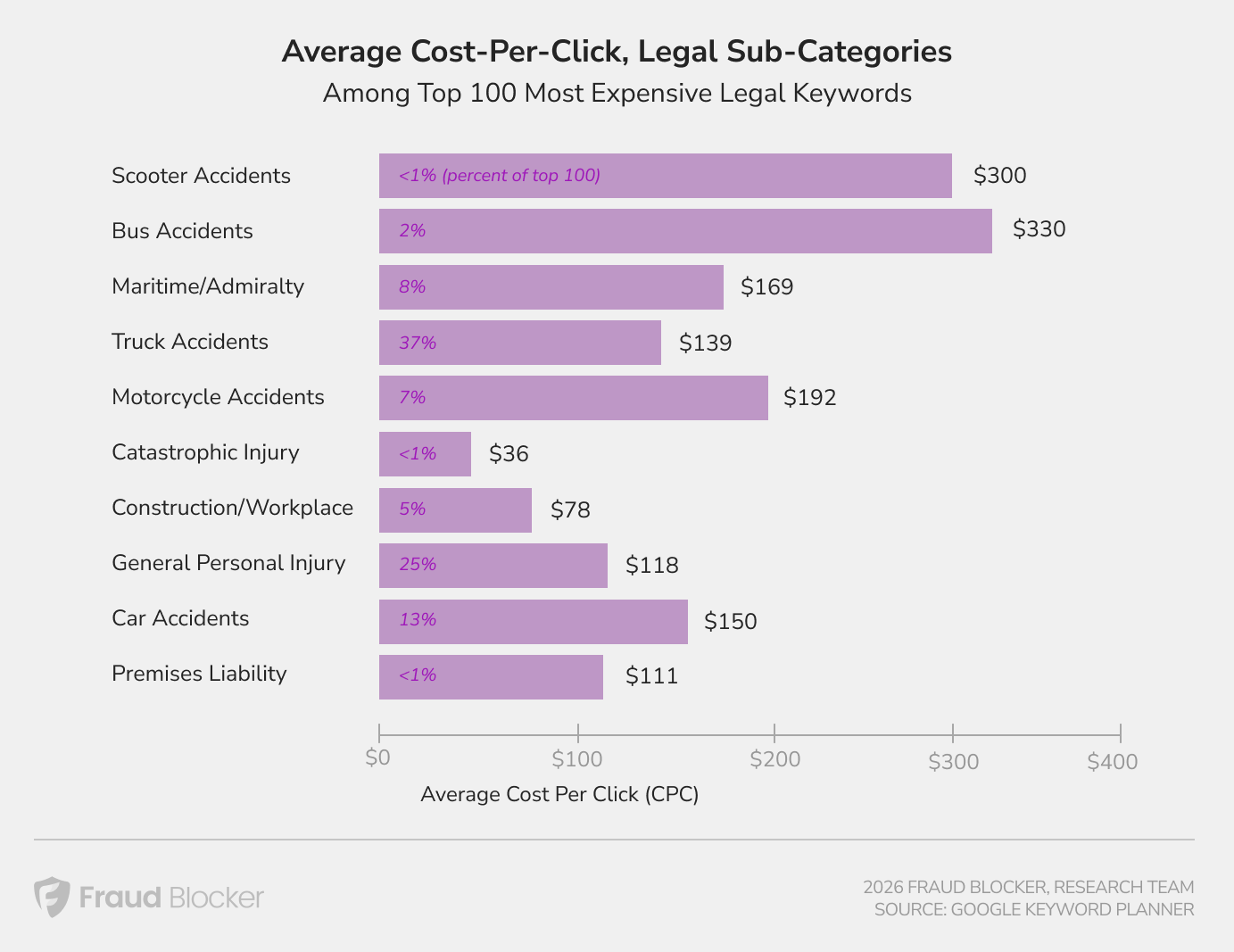 Below, we’ve broken down the top 100 legal keywords, analyzed what’s driving these astronomical prices, and outlined how you can protect your firm’s budget from click fraud.