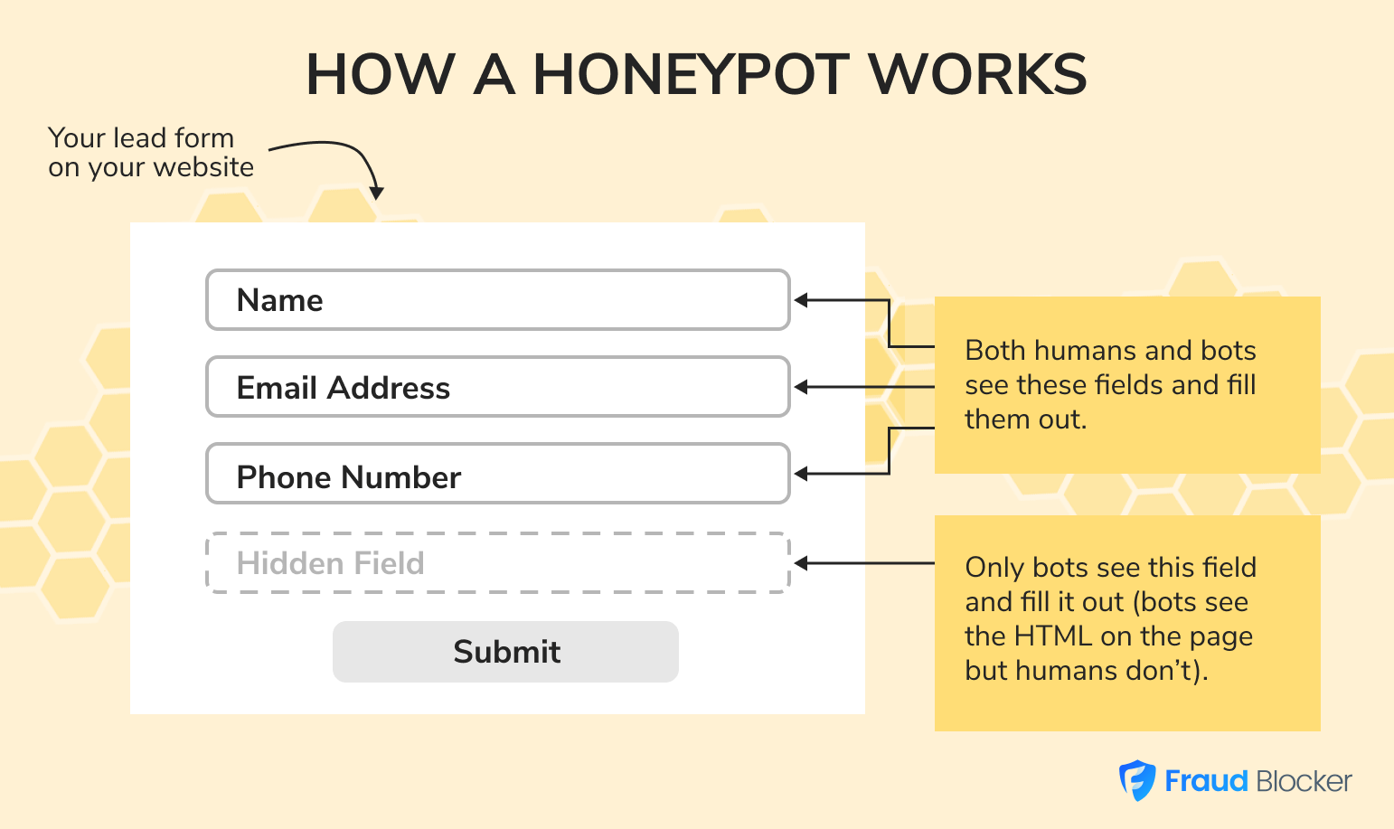 A real, human user completes the online form fields they see visible on a website or landing page, such as their name and email address. However, a “honeypot” creates an additional invisible field. Bots complete this field because they are only can see the raw HTML on the page. Marketers can then easily see which leads completed the ‘hidden’ field and immediately attribute those sources to a robot and block them from future ad campaigns.