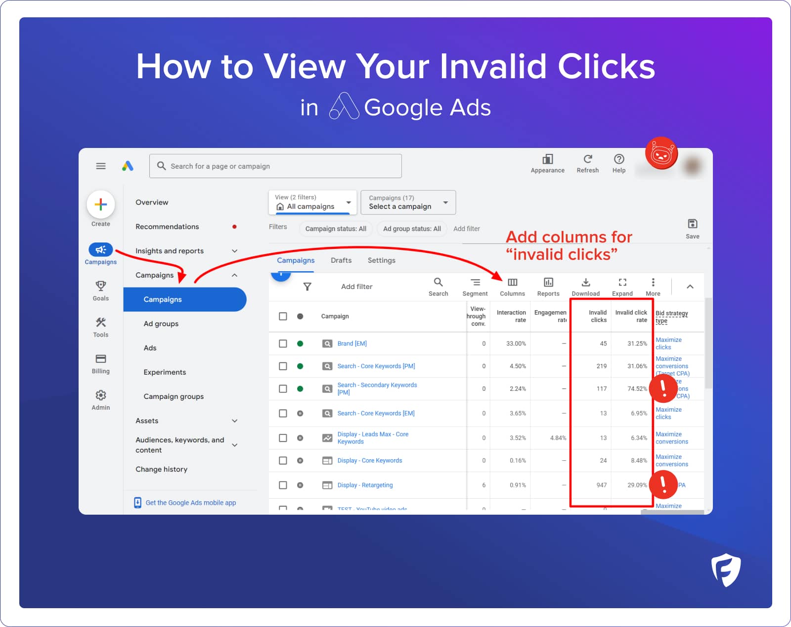 You can view the amount of invalid clicks detected by Google Ads in your main reports dashboard. Here’s how:
